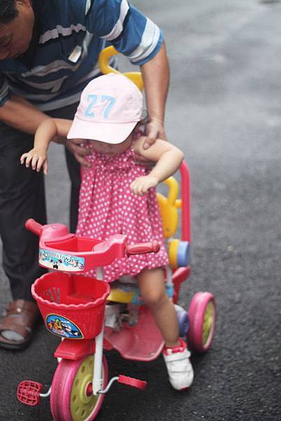 這天下起毛毛雨 中午小芸芸硬是吵著要騎車車,阿公只好陪著芸芸繞一圈,讓她過過癮